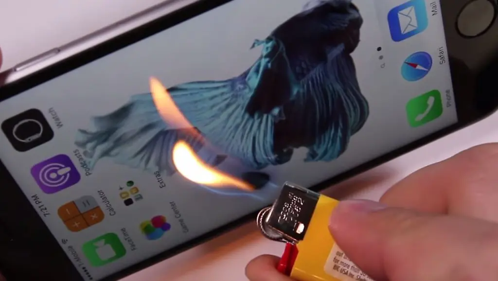 Der Youtuber hat auch noch eine andere Tortur auf Lager, bei der das iPhone 6s demonstriert, dass es ein Stück weit feuerfest ist. Er hält einige Sekunden eine Feuerzeug-Flamme unters Display, was es scheinbar völlig unbeschadet übersteht.
