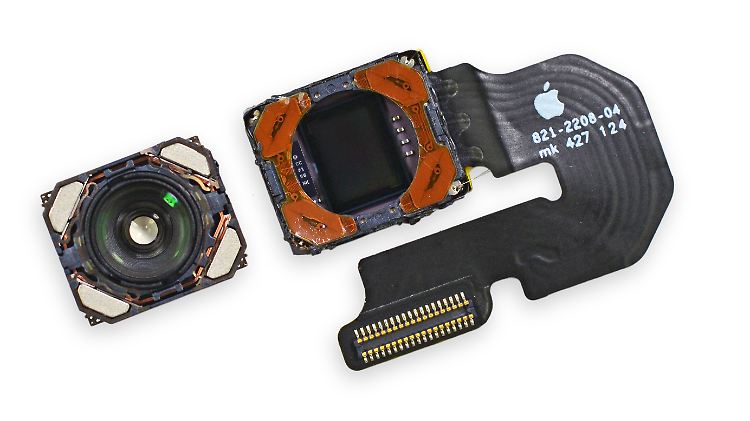 Neben größerem Display und Akku unterscheidet sich das iPhone 6 Plus von seinem kleineren Bruder vor allem durch einen optischen Bildstabilisator an der Kamera. Dabei wird das Objektiv durch winzige elektromagnetische Motoren schnell hin und her bewegt. Gesteuert wird die Schwingung anhand von Informationen des iPhone-Gyroskops in Zusammenarbeit mit dem Koprozessor M8. Damit man das von vier Motoren umgebene Objektiv des iPhone 6 Plus sehen kann, hat iFixit auch das Kameragehäuse geöffnet. Das Bauteil sieht nicht spektakulär aus. Wie erste Tests gezeigt haben, arbeitet die optische Bildstabilisierung des iPhone 6 Plus aber sehr effektiv.