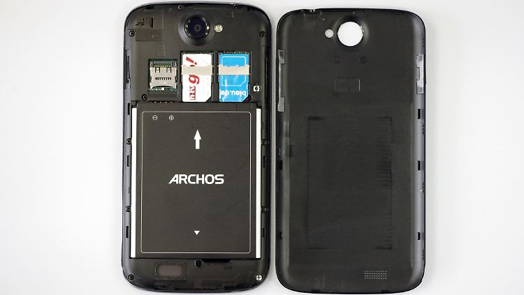 Bei einem günstigen Gerät ist auch interessant, ob die Verarbeitung stimmt. Und siehe da, das Platinum 53 ist ein relativ solides Stück Technik, bei dem keine hässlichen Spalten zwischen Rahmen und Display klaffen und auch die Plastik-Rückseite gut sitzt. An den dünnsten Stellen kann man den Kunststoff-Rahmen aber vom Touchscreen wegziehen und der Ein-/Aus-Schalter, der im Akku-Deckel untergebracht ist, hat sich beim Abziehen vorübergehend aus der Halterung gelöst.
