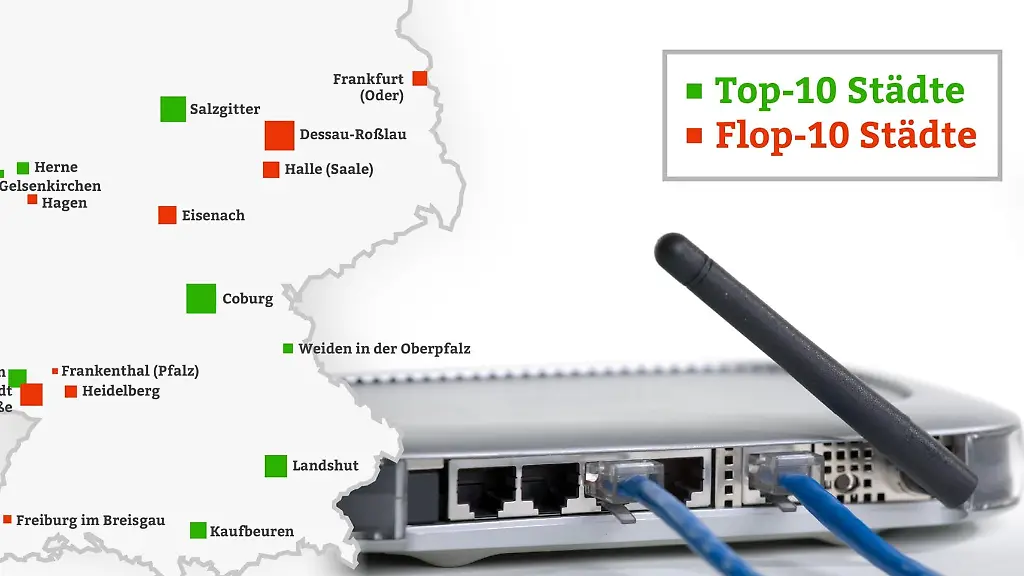 Mit einer mittleren Downloadrate (Median) von gut 67 Megabit pro Sekunde (Mbit/s) führt das bayerische Coburg das Ranking an - deutlich vor dem niedersächsischen Salzgitter und Landshut (Bayern), wo derzeit jeweils gut 50 Mbit/s gemessen werden. Fast ebenso schnell ist man in Kaiserslautern (Rheinland-Pfalz) unterwegs. Die Top 10 vervollständigen Kaufbeuren (Bayern), Bottrop (Nordrhein-Westfalen, NRW), Herne (NRW), Weiden in der Oberpfalz (Bayern), Gelsenkirchen (NRW) und Mülheim an der Ruhr (NRW).