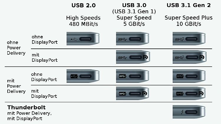 Die Unterschiede sind erheblich. So sind mit USB 2.0 nur Übertragungsraten von 480 MBit/s möglich, beim "alten" USB 3.0 sind es bereits 600 MBit/s, die erste Generation von USB 3.1 (das neue 3.0) erreicht 5 GigaBit/s, die zweite Generation sogar 10 GigaBit/s.