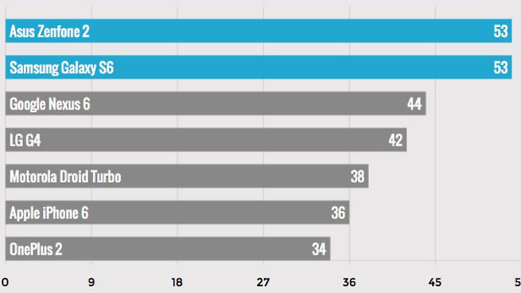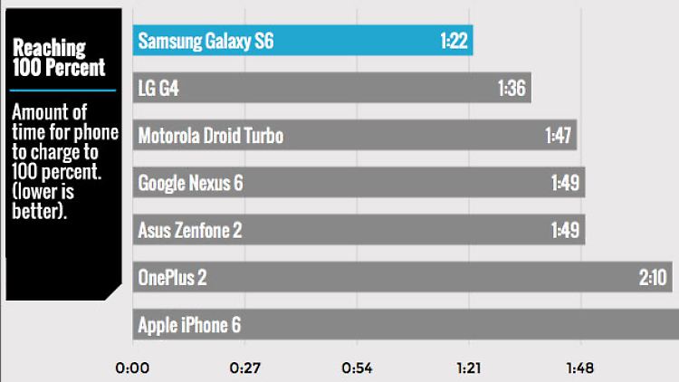 In der Folge setzte sich Samsung dank seiner eigenen Schnellladetechnologie an die Spitze: Nach nur 48 Minuten hatte der Akku des S6 bereits 80 Prozent Ladung erreicht, beim Zenfone 2 dauerte es 56 Minuten. Das iPhone 6 benötigte mit 1:15 Stunden deutlich länger. Auf den letzten Metern benötigten dann alle Smartphones deutlich mehr Zeit - bis zum Erreichen der 100-Prozent-Marke vergingen beim S6 weitere 34 Minuten, die volle Ladung hatte es nach 1:22 Stunden erreicht. Auf dem zweiten Platz liegt hier das LG G4. Mit 1:36 Stunden zieht es am Droid Turbo (1:47), dem Nexus 6 und dem Zenfone 2 (beide 1:49) vorbei. Das OnePlus 2 braucht 2:10 Stunden, das iPhone 6 liegt mit satten 2:35 Stunden abgeschlagen auf dem letzten Platz.
