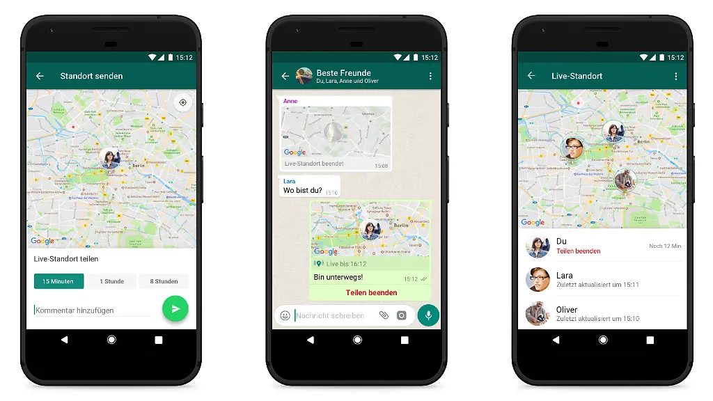Whatsapp wurde bei der Einführung des Live-Standorts übrigens ganz knapp von Telegram überholt. Die beliebte Messenger-Alternative hat die praktisch identische Funktion schon eine Woche früher eingeführt. Bei Telegram kann man auch wie in Whatsapp zwischen drei Tracking-Zeiten wählen: 15 Minuten, eine Stunde oder 8 Stunden. Andererseits war Whatsapp-Besitzer Facebook noch schneller, bei dessen Messenger kann man den Live-Standort schon seit März seinen Chat-Partnern zeigen. Ebenfalls seit März kann man unabhängig von Nachrichten-Apps seinen Standortverlauf auch via Google Maps in Echtzeit teilen.
