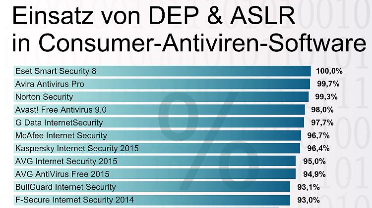 Die einzigen Produkte, die ASLR und DEP zu 100 Prozent einsetzen, kommen von ESET (Consumer) und Symantec (Business). Avira, G Data, McAfee und AVG setzen den Zusatzschutz zu 100 Prozent nur in den 64-Bit-Dateien ihres Produkts ein. Bei 32 Bit schwankt der Wert zwischen 90 und fast 100 Prozent. Insgesamt setzt die Hälfte aller Schutzpakete zu über 90 Prozent auf den Einsatz von ASLR und DEP. Am wenigsten verwenden eScan (17,5 Prozent) und Kingsoft (19 Prozent) die Techniken. Von den bekannten Anbietern fällt vor allem Trend Micro mit 71,8 Prozent auf.