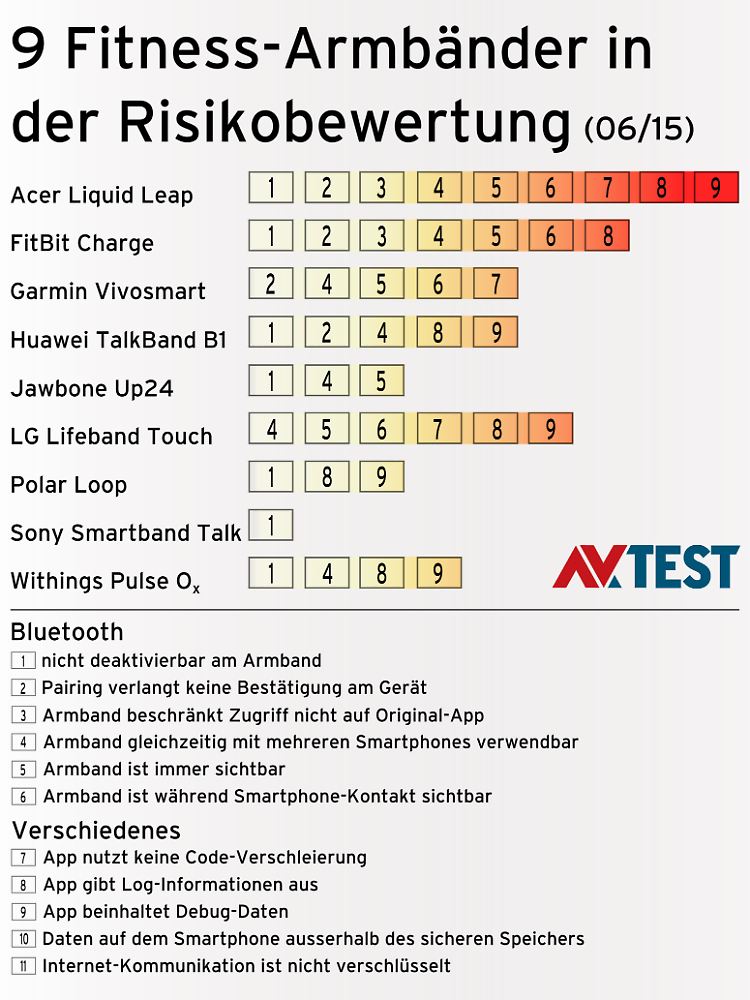 Das unabhängige Testlabor AV-Test hat neun Fitness-Tracker untersucht, die mit Android-Smartphones zusammenarbeiten. Die Prüfer stellten dabei fest, dass viele Hersteller mit dem Datenschutz viel zu lässig umgehen. Die getesteten Produkte: Acer Liquid Leap, FitBit Charge, Garmin Vivosmart, Huawei TalkBand B1, Jawbone Up24, LG Lifeband Touch FB84, Polar Loop, Sony Smartband Talk SWR30 und Withings Pulse O.