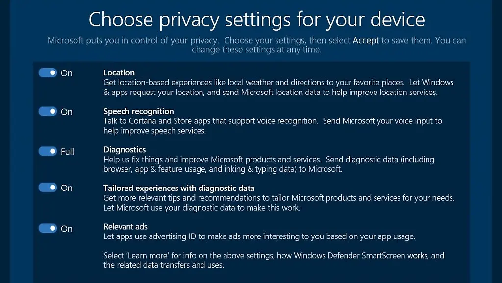 Nach der Aktualisierung zeigt das Setup beim Wechsel von Windows 7 und 8 oder bei einer Neuinstallation die wichtigsten Privatsphäre-Einstellungen auf einen Blick an. Nutzer können dann die Installation erst fortsetzen, wenn sie diese Einstellungen vorgenommen haben. Wer Windows 10 bereits auf seinem Rechner laufen hat, sieht eine Benachrichtigung, in der er aufgefordert wird, die Datenschutz-Einstellungen entsprechend des neuen Setups vorzunehmen.
