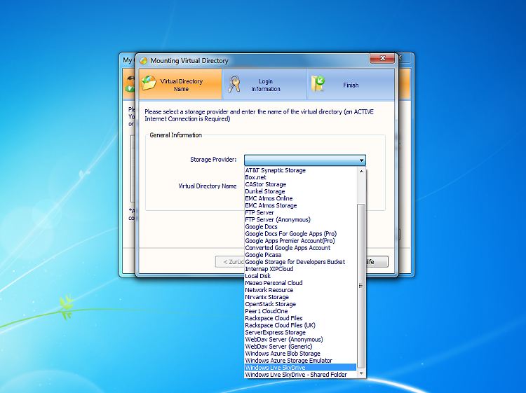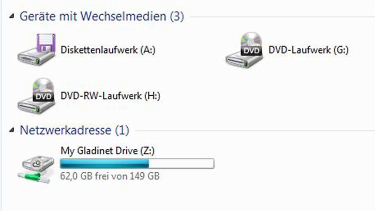 Gladinet holt Skydrive als virtuelles Laufwerk in den Windows Explorer. Die Starter-Edition ist kostenlos und reicht für Otto-Normal-Nutzer völlig aus. Während der Installation wird man gebeten, den Dienst zu wählen, den man einbinden möchte. Denn Gladinet kann neben Skydrive auch viele andere Online-Speicher "mounten", darunter Google Docs (Text & Tabellen). Nachdem man Skydrive gewählt hat, meldet man sich mit seiner Windows Live ID an und folgt den weiteren Schritten. Ist das Programm installiert, findet man Skydrive unter "Computer" als virtuelle Festplatte. Leider gibt es Gladinet bisher nur auf Englisch.