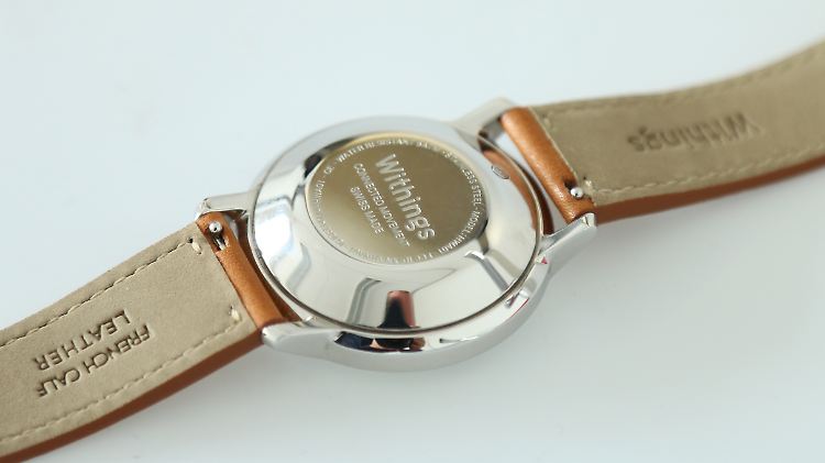 Das leicht gewölbte Saphirglas ist kratzfest, der Korpus ist aus Edelstahl. Das Armband aus hellbraunem Kalbsleder ist schlicht und stilvoll und lässt sich leicht austauschen - im Lieferumfang ist ein weiteres Armband aus weichem Silikon enthalten, das man zum Sport und zum Schwimmen anlegen kann. Aufladen lässt sich die Uhr nicht, aber die Batterie soll acht Monate halten. Ein zweite Knopfzelle liegt ebenfalls bei, außerdem ein Werkzeug, mit dem man die Batterie selbst auswechseln kann. Das Gehäuse trifft mit einem Durchmesser von 36,3 Millimetern die goldene Mitte zwischen Damen- und Herrenuhren. Es ist fast etwas klein für ein Männerhandgelenk, man gewöhnt sich aber an die Größe. Trotzdem wäre es sinnvoll, die Uhr in zwei Größen anzubieten.