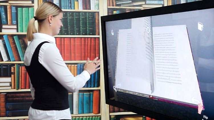 Alte Bücher bleiben meist verwahrt in Archiven und hinter Glasvitrinen - undenkbar, dass Interessierte in den wertvollen Drucken blättern. Auf der Cebit hat das Fraunhofer Institut nun eine neue 3D-Technik vorgestellt, d ie historische Bücher für jedermann erfahrbar macht. Nutzer können sich die Bücher vor einem großen Bildschirm anschauen und sie mit Handbewegungen drehen, vergrößern und die einzelnen Seiten wenden. Möglich macht das eine Kamera, die Bewegungen der Nutzer nachvollzieht.
