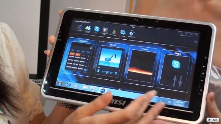 Mit MSI hat in Taipeh noch ein weiteres Schwergewicht der Branche seinen Hut in den Tablet-Ring geworfen. Es hat das WindPad 100 präsentiert. Das 800 Gramm leichte Gerät ist 10 Zoll groß, das Display bietet 1024 x 600 Bildpunkte. Unter dem Touchscreen arbeitet der Intel-Prozessor Atom Z530, der Akku soll bis zu acht Stunden durchhalten. Das WindPad verfügt über zwei Gigabyte Hauptspeicher, eine SSD-Einheit mit 32 Gigabyte, SD-Slot, WLAN, UMTS, USB und HDMI. Das Tablet soll noch in diesem Jahr auf den Markt kommen, als Preis peilt MSI 500 Dollar an.