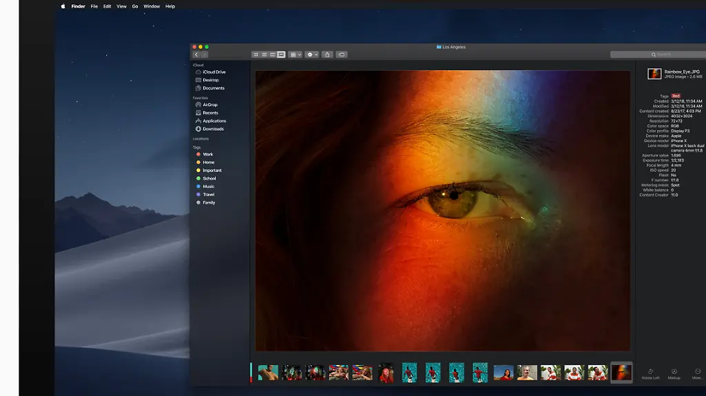 Zusätzliche Optionen zu einer markierten Datei sieht man auch, wenn man die Leertaste drückt. Man kann dann unter anderem Bilder drehen oder Dateien direkt teilen. Seltsam: Wenn man ein Bild zuschneiden möchte, muss man vorher auf Markieren klicken. Der Finder zeigt jetzt außerdem bei Fotos alle Metadaten an, wenn man auf Mehr anzeigen klickt.