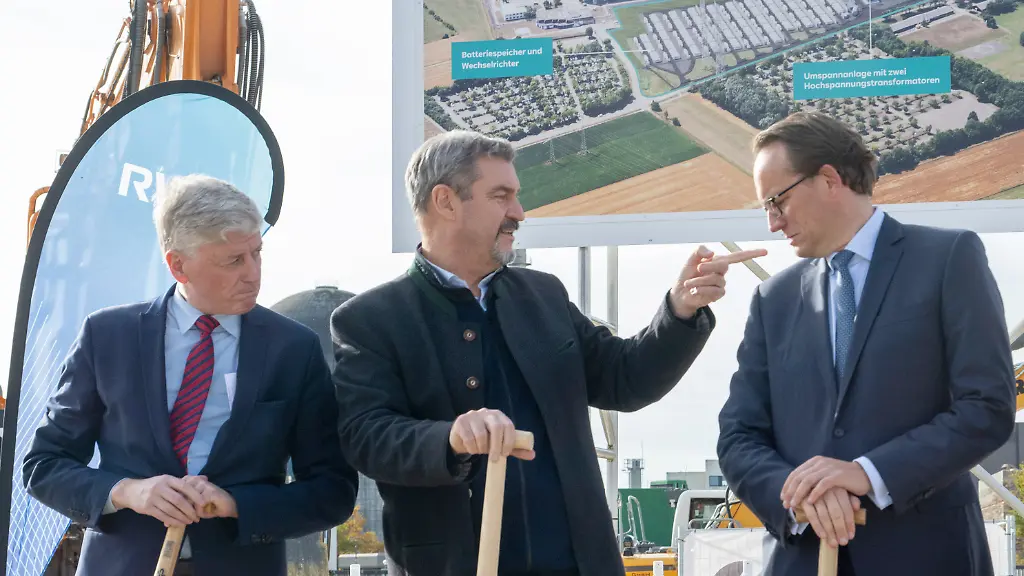 Nur wenige Tage nach der Sprengung der beiden Kühltürme des stillgelegten Atomkraftwerks Gundremmingen im Landkreis Günzburg hat der bayerische Ministerpräsident Markus Söder auf dem Gelände den symbolischen Spatenstich für einen riesigen Batteriespeicher gesetzt. Es wird laut dem Energiekonzern RWE der größte Batteriespeicher Deutschlands. Die Anlage werde eine Leistung von 400 Megawatt und eine Speicherkapazität von 700 Megawattstunden haben, erklärte RWE am Mittwoch.