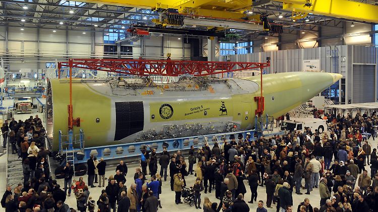 In einer Feierstunde nehmen Airbus-Mitarbeiter im Werk Bremen Abschied von dem fertiggestellten Rumpf für den A400M.