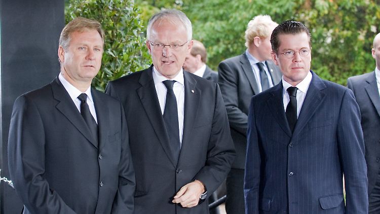 Hartmut Ostrowski, Jürgen Rüttgers und Karl-Theodor zu Guttenberg (l-r) treffen bei der Trauerfeier für Reinhard Mohn ein.