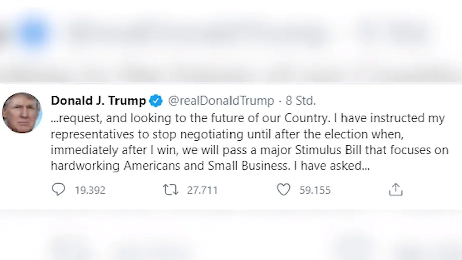 Seit März hat der US-Kongress bereits Konjunkturpakete in Höhe von rund drei Billionen Dollar auf den Weg gebracht. Dem Streit zwischen Demokraten und Republikanern über weitere Corona-Hilfen macht Präsident Trump nun vorerst ein Ende. Bis nach seiner Wahl liegen die Verhandlungen auf Eis.