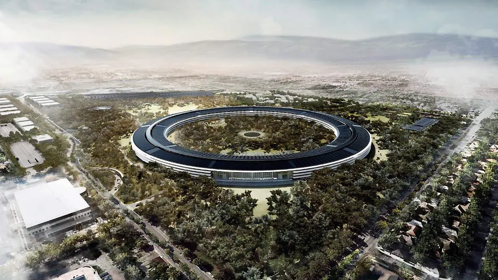 Wenn Apple baut, dann groß: Ein Gebäude, das sie selbst "Spaceship" nennen, mit 260.000 Quadratmetern Platz und einem Außenumfang von 1,6 Kilometern. Man könnte auch an einen gläsernen Riesen-Donut denken, das Loch in der Mitte wird der grüne Innenhof. Durch die großen Glasflächen sollen die Mitarbeiter sich eins fühlen können mit der Natur. In den Untergrund wird ein versunkenes Auditorium gebaut mit Platz für 1000 Menschen, hier werden künftig die neuen Apple-Produkte vorgestellt.