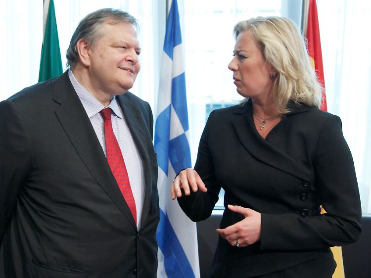 Der griechische Finanzminister Evangelos Venizelos und Finnlands Finanzministerin Jutta Urpilainen.