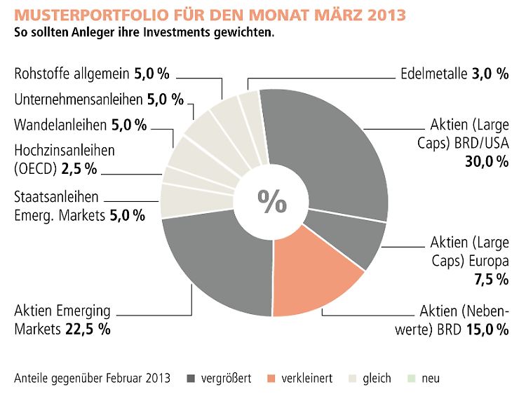 Asset-Allokation: Im monatlichen Musterdepot wird der gesamte Aktienanteil bei 75% beibehalten, wobei Large - Caps aus den USA und Deutschland auf 30% erhöht und Nebenwerte aus Deutschland auf 15% reduziert werden. Dagegen wurden Aktien aus den Emerging Markets auf 22,5% erhöht. Blue Chips aus Europa werden mit 7,5% gewichtet. Anleihen aus den Emerging Markets bleiben bei 5% gewichtet. Edelmetalle, Unternehmens- und Wandelanleihen sowie Hochzinsanleihen bleiben unverändert. Rohstoffinvestments werden in Höhe von 4,5% weiterhin gewichtet.