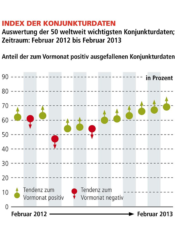 Die Ergebnisse zum Welt-Index bestätigen den positiven Kurs der Weltwirtschaft. Die Geschwindigkeit der Konjunkturerholung bleibt trotz aller Skepsis zum Ausgang der strukturellen Verschuldungsprobleme in Europa und den USA stabil und positiv. Zum sechsten Mal in Folge verbesserten sich die Ergebnisse des "Index der Konjunkturdaten" auf ein aktuelles Niveau von 69% (Vormonat: 67%) und untermauern den Aufwärtstrend der Weltwirtschaft.