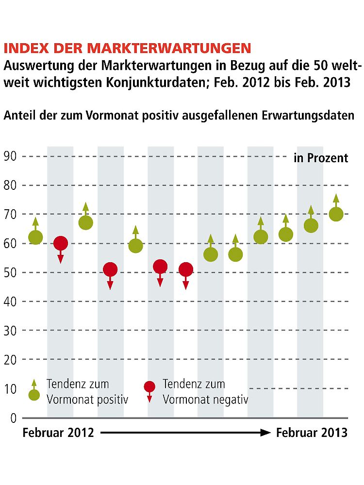 Noch interessanter wertet der Vermögensverwalter aber die Entwicklungen des "Index der Markterwartungen". "Nach wie vor dominiert die Skepsis aufgrund vieler fiskalpolitischer Probleme in Europa und den USA" so Zschaber. Seit über einem halben Jahr wird regelmäßig im Rahmen dieser Berichterstattung zum Welt-Index darauf hingewiesen, dass die Weltwirtschaft hohen Untersättigungseffekten ausgesetzt ist, die sich jetzt zunehmend schließen werden. Dies ist Ausdruck einer positiven konjunkturellen Robustheit, die durch viele Marktteilnehmer noch verkannt wird. Das Resultat sind positive Überraschungen auf der Konjunkturseite, was wiederum dazu führt, dass viele Akteure, die noch Abseits der Aktienmärkte sind auf den Einstieg warten, förmlich sogar zum Kauf gedrängt werden, was zu positiven Aktienkursen führt. Wie hoch die positive Überraschungsdynamik aktuell ist, zeigt der Stand des "Index der Markterwartungen" mit einem Niveau von 70% (Vormonat: 66%). Das bedeutet, 70% der analysierten Konjunkturdaten haben die allgemeinen Erwartungen übertroffen.