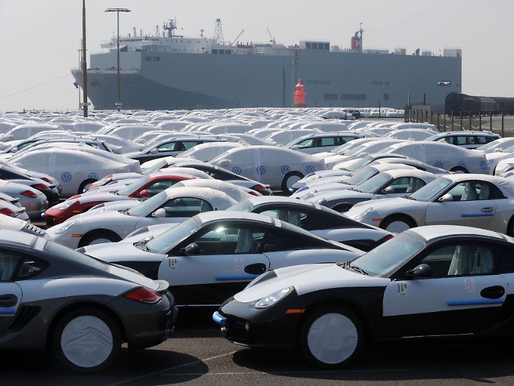 Ein Schiff wird kommen: Porsche-Neufahrzeuge warten am Volkswagen-Autoterminal am VW-Werk Emden auf ihre Reise über den Atlantik.