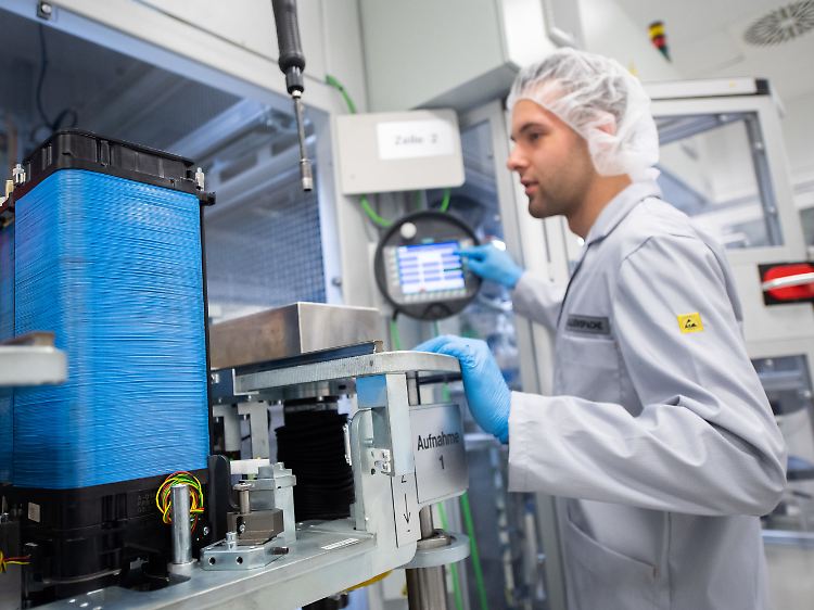 Der Mitarbeiter des Autozulieferers ElringKlinger bedient mit einem Terminal eine Brennstoffzellen-Stackbauanlage.