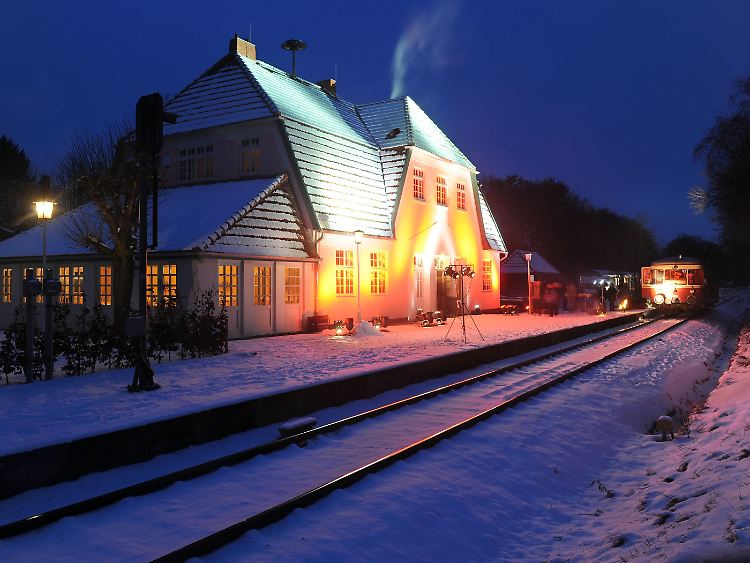 Projekt Worpswede 1910: Zur Wiedereröffnung illuminierten farbige Strahler den frisch restaurierten Bahnhof im Künstlerdorf Worpswede (Kreis Osterholz).