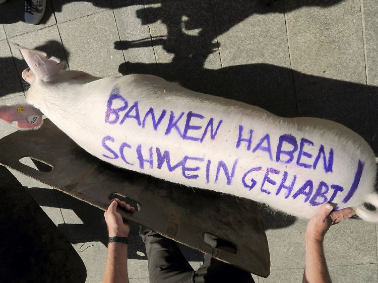 Zuvor hatten Bauern ein lebendes Schwein vor die Börse getrieben. Bauernverbands-Präsident Gerd Sonnleitner zeigte sich an der bekannten Skulptur "Bulle und Bär" mit der Sau, die auf dem Rücken die Aufschrift trug: "Banken haben Schwein gehabt." Sonnleitner sagte, die Bauern bräuchten ebenso ein Konjunkturpaket wie Handwerker und Automobilindustrie.