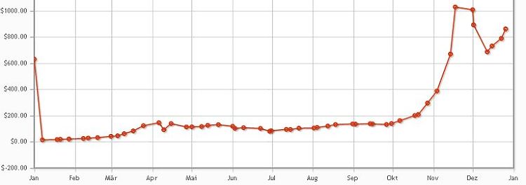 Dieses Geld kann in teilnehmenden Läden zum Einkaufen verwendet werden. Der Kurs ergibt sich aus Angebot und Nachfrage an unregulierten Tauschbörsen. Und im vergangenen Jahr ist die Nachfrage regelrecht explodiert: Am Beginn des letzten Jahres stand ein Bitcoin bei rund 20 Dollar, im Dezember erreichte er zwischenzeitlich 1200 Dollar. Zwischendurch brach der Kurs immer wieder ein, nur um sich kurz darauf wieder rasant zu erholen. Derzeit kostet ein Bitcoin knapp über 1000 Dollar.
