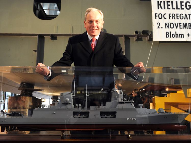 Gut für die Mitarbeiter, sagt der Vorstandsvorsitzende der ThyssenKrupp Marine Systems AG (TKMS), Hans-Christoph Atzpodien. Hier steht er im Baudock 12 von Blohm+Voss in Hamburg nach der feierlichen Kiellegung der ersten Fregatte F125 an einem Modell des Schiffes.