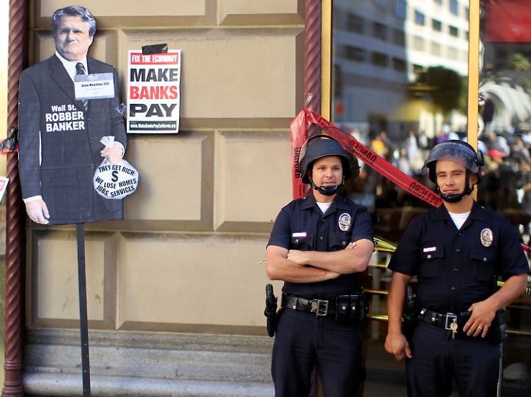 2011 noch durchaus übliche Proteste: "Make Wall Street Banks Pay" neben einem Conterfei von Moynihan.