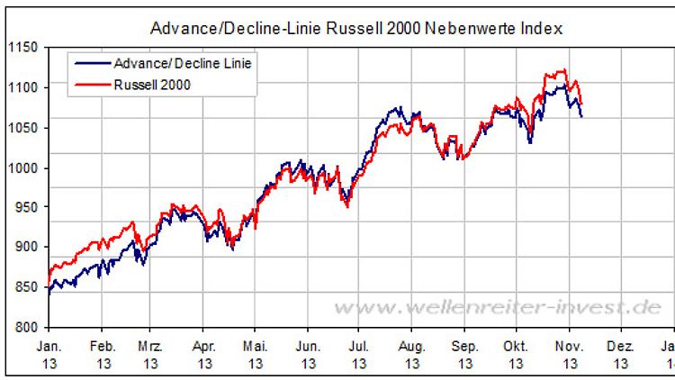Positiv ist, dass die Advance-Decline-Linie des Russell 2000 keine negative Divergenz zeigt (folgender Chart).