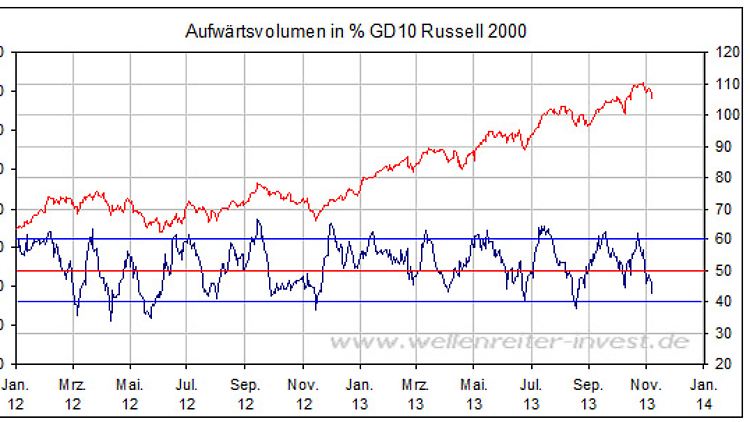 Anfang der kommenden Woche wird sich der Russell 2000 in einer überkauften Situation befinden. Dies zeigt das Aufwärtsvolumen in Prozent (folgender Chart).