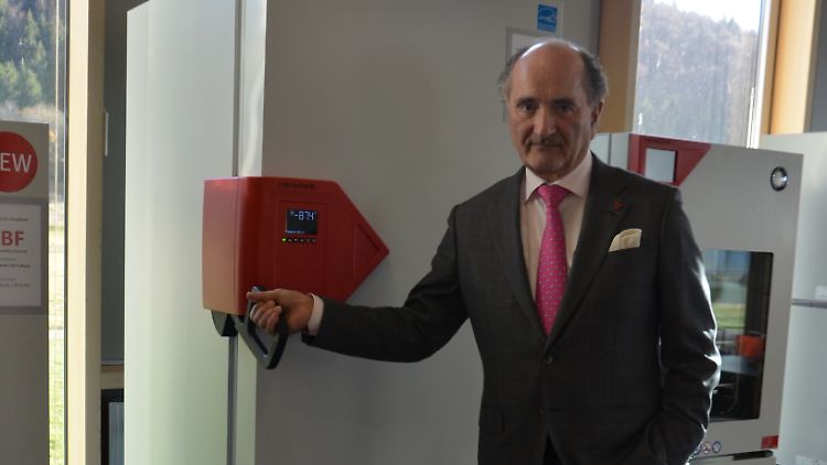 Mit dem Laborausrüster Binder rechnet ein weiterer deutscher Mittelständler mit hohen Umsätzen. Das Unternehmen aus Tuttlingen in Baden-Württemberg baut "Ulfs", wie DHL sie einsetzt. "Darin sind mehrstufige Kälte-Anlagen eingebaut, die in der Lage sind, das Temperaturniveau auf minus 90 Grad zu bringen. Die zweite starke Eigenschaft ist eine Art Super-Isolation. Dadurch hat der Schrank an der Außenseite Zimmertemperatur, aber im Inneren können es minus 90 Grad sein", erklärt CEO und Firmengründer Peter Michael Binder, wie sich ein Ultratiefkühlschrank von der klassischen Gefriertruhe unterscheidet.