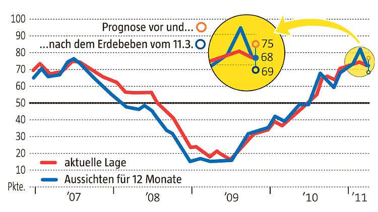 Danach lag der Prognose-Faktor der seit dem vergangenen Wochenende eingegangenen Antworten bei 69 Punkten. Vor dem schweren Erdbeben am Freitag hatte die gewichtete Erwartungskomponente noch bei 75 Punkten gelegen. Insgesamt ist der Erwartungswert damit im März gegenüber dem Vormonat um 10,8 Prozent auf 73 Punkte gesunken. Einen solch starken Rückgang hatte es im Ökonomen-Barometer zuletzt im März 2009 gegeben. Trotz dieses Dämpfers liegt die Erwartungskomponente jedoch weiter deutlich über der Marke von 50 Punkten, die eine wirtschaftliche Belebung signalisiert.