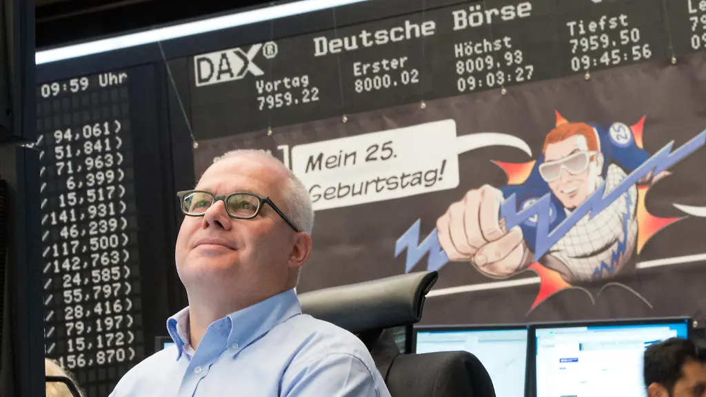 Die Wirklichkeit schien im recht geben zu wollen: An seinem 25. Geburtstag startet der Dax am Morgen nach düsteren Vorzeichen noch freundlich in den Handel und sprang gleich zu Beginn über die 8000-Punkte-Marke. Noch am Vormittag des Jubiläums trübte sich die Stimmung allerdings wieder ein.