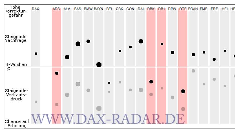Die Chartanalyse des Dax ist die eine Seite der Medaille, mindestens ebenso wichtig ist der Blick unter die Oberfläche und damit auf die Verfassung der 30 Indexmitglieder (siehe Chart 2). Um nicht den Überblick zu verlieren, bietet sich das Konzept der Relativen Stärke an, mit der die Trendstärke einer Aktie gemessen wird (die Signale der Grafik können Sie hier "2014 birgt Überraschungen für den Dax" nachlesen). Die mittelfristige Tendenz wird in der Grafik über die Balkenfarbe angezeigt. Derzeit dominiert die Farbe Grau, die Mehrzahl der Dax-Aktien notiert somit in einem Seitwärtstrend. Lediglich bei Lanxess, RWE und ThyssenKrupp ist die Tendenz aufwärts gerichtet. Grundsätzlich besteht somit noch viel Potenzial nach oben, vor allem für die Indexschwergewichte. Die Größe der schwarzen Punkte stellt die Gewichtung im Dax dar. SAP und Siemens befinden sich noch in einem Abwärtstrend, Allianz, BASF, Bayer und Daimler sind einen Schritt weiter. Vor allem im kurzfristigen Bereich schlägt das Pendel nun deutlich in Richtung der Bullen. Abgesehen von wenigen Ausnahmen eroberten bereits viele Aktien ihren Vier-Wochen-Durchschnitt zurück. Zudem trumpfen vor allem die richtungsweisenden Indexschwergewichte mit einer deutlich ansteigenden Trenddynamik auf. Die aktuelle Relative Stärke liegt jeweils klar über dem Vorwochenniveau, das über einen grauen Punkt dargestellt wird. Zugleich ist noch viel Platz Richtung Norden, denn die Gefahr einer Korrektur steigt erst an, wenn die oberen Bereiche der Matrix erreicht werden. Von einer Überhitzung kann somit weder kurz- und erst recht langfristig nicht gesprochen werden.