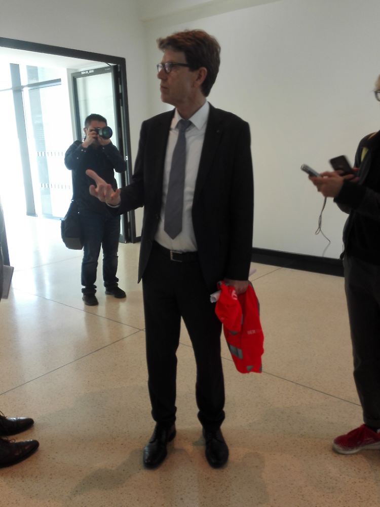Passend zur Zuversicht, geht er schnell und dabei fast lässig. Sorgen hat er nicht, glaubt man seinem Gang. Er gibt den Hausherrn, aber er hält Distanz zum Pannen-Bau. Es ist ja auch nicht seine verkorkste Geschichte. Der Tross hinter ihm wird derweil immer länger. Sportlich hüpft er auf ein Passagierlaufband, das nicht in Betrieb ist. Dort schlendert er entlang, während die Journalisten artig nebenherrennen, als wollten sie dem Laufband nicht so recht trauen. Es könnte sich ja doch plötzlich in Bewegung setzen. Der Hausherr weiß es besser. Zumindest ein Kameramann erkennt die Gunst der Stunde und rennt vorneweg, um ihn schnell noch abzulichten.