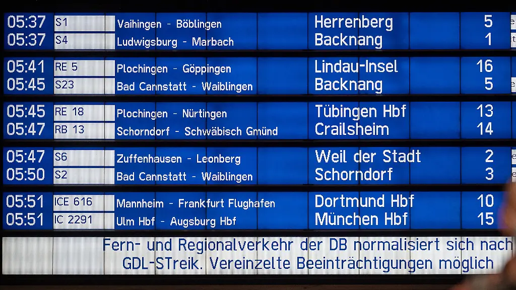 Damit gilt wieder der reguläre Fahrplan. Im Hochlauf am Freitag könne es aber noch zu einzelnen Einschränkungen kommen, hatte die Bahn schon während des Streiks deutlich gemacht. Das kann etwa der Fall sein, wenn Züge zu Betriebsbeginn an anderen Orten stehen. Man arbeite daran, den reibungslosen Betrieb auf allen Linien möglichst schnell wiederherzustellen, hieß es.