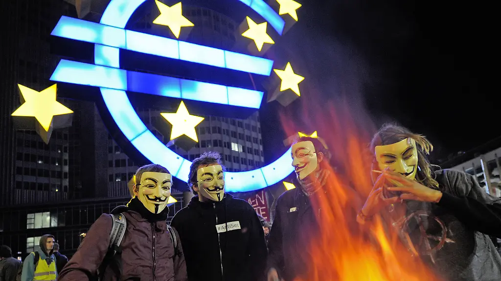 Schuld daran waren auch die Occupy-Demonstranten, die Mario Draghis Geldpolitik kritisierten und ihren Ärger mithilfe von Steinen Luft machten. Da flog dann auch schon mal ein gelber Euro-Stern, der symbolisch ein Land der Eurozone repräsentierte. Es ging nicht nur um die Beschädigung des Eurozeichens, sondern um Wut auf das kapitalistische System.