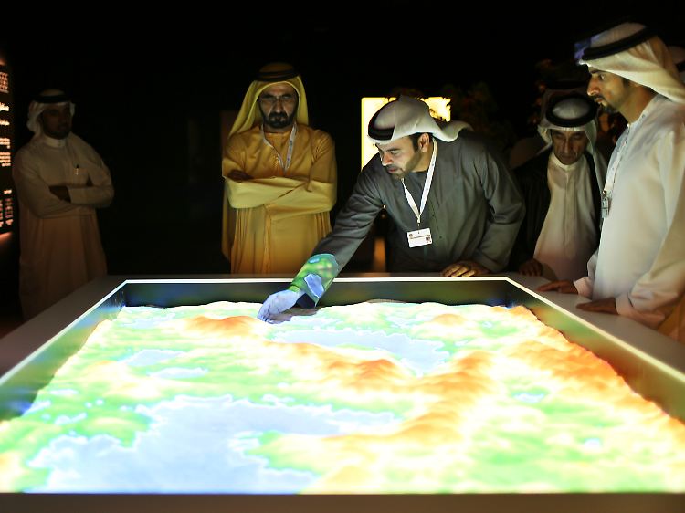 Minister der Vereinigten Arabischen Emirate beraten sich über einer Weltkarte aus Sand.