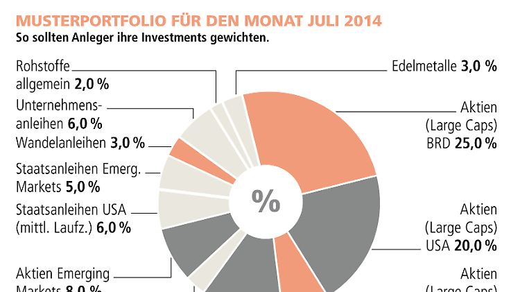 Beibehalten werden: Edelmetalle bei 3%; Rohstoffe bei 2%; Unternehmensanleihen bei 6%; Staatsanleihen Emerging Markets bei 5%; Staatsanleihen USA bei 6%; Aktien Japan bei 3%;