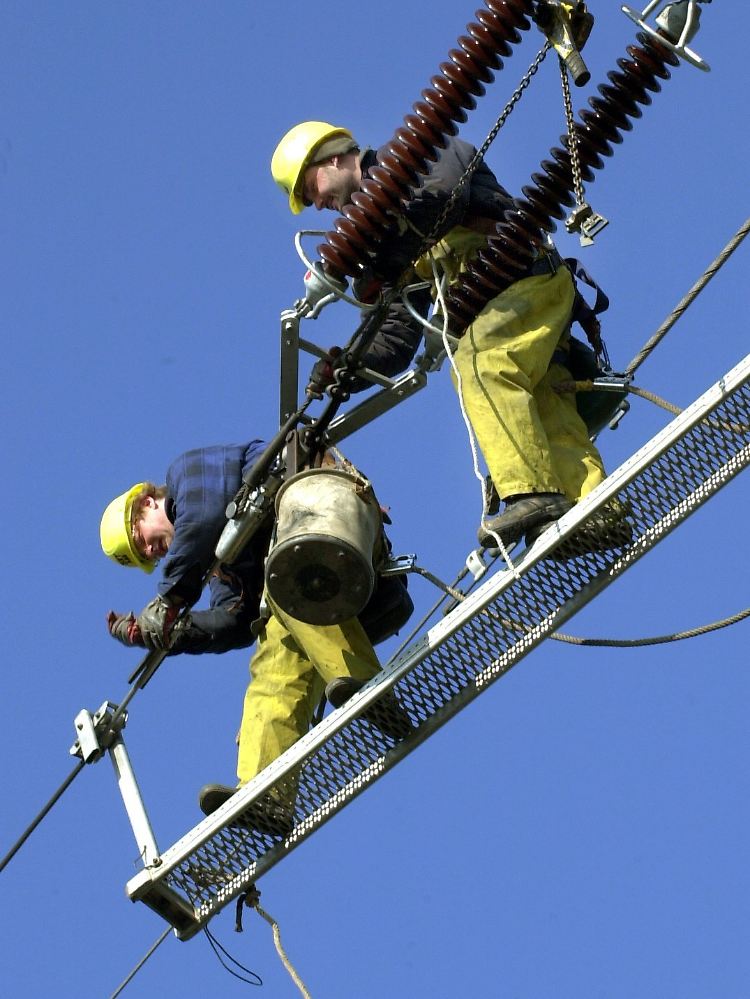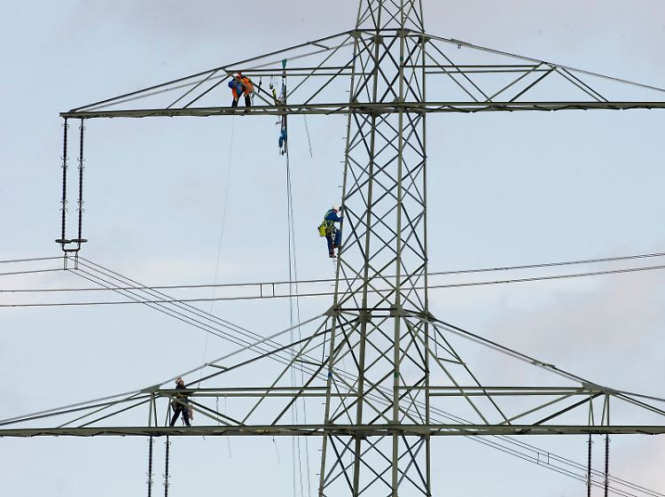 Kostspielige Infrastruktur: Monteure arbeiten an einer 110-KV-Hochspannungsfreileitung in 20 Metern Höhe.