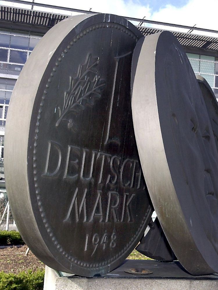 Eine übergroße Deutsche Mark, Teil eines Brunnens vor der Deutschen Ausgleichsbank in Bonn als Zeichen für die Währungsreform 1948.