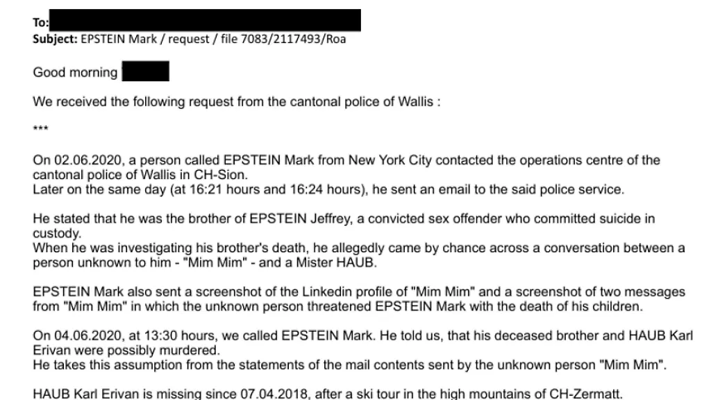 Konkret geht es um drei Seiten aus den Epstein Files, einem umfangreichen Aktenkonvolut aus Ermittlungen US-amerikanischer und internationaler Behörden. Die Dokumente belegen einen Kontakt zwischen Mark Epstein, dem Bruder von Jeffrey Epstein, und der Kantonspolizei Wallis im Jahr 2020.