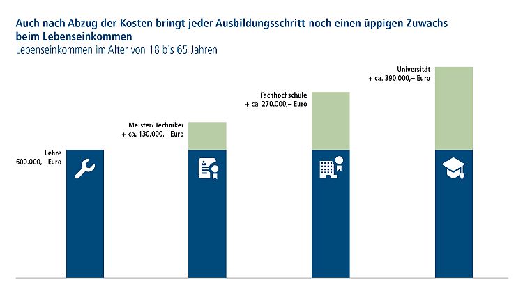 Als Vergleichsgrundlage nutze das Institut das durchschnittliche Lebenseinkommen eines Arbeitnehmers ohne Berufsausbildung. Mit einer abgeschlossenen Lehre steige dies den Angaben zufolge bereits um durchschnittlich 143.000 Euro netto - wobei Meister oder Techniker noch einmal deutlich besser verdienen als Erwerbstätige mit einer einfachen Ausbildung. Zudem werden sie von der Wirtschaft händeringend gesucht.