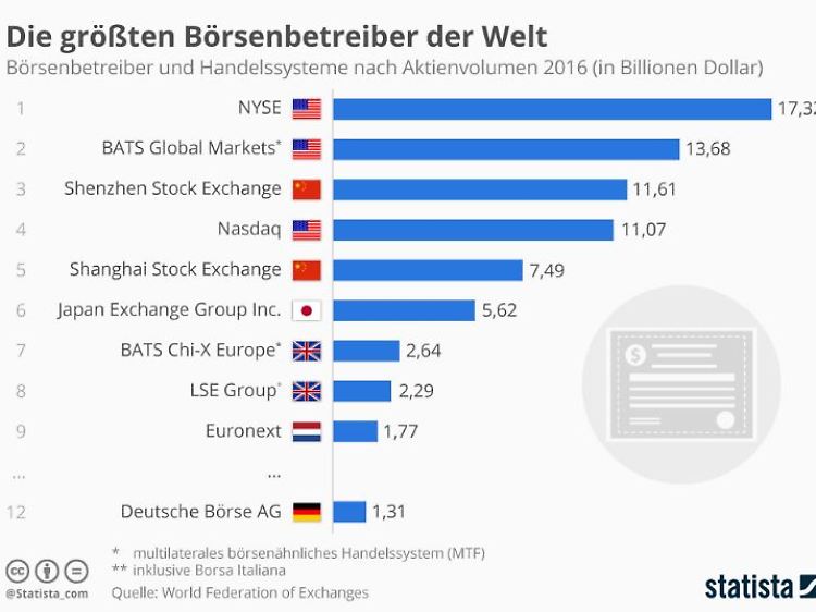 Der Börsenbetreiber Euronext ist deutlich größer als die Deutsche Börse. Mit einem Handelsvolumen von knapp 1,8 Billionen Dollar kommt er im internationalen Ranking auf Platz 9, während die Deutsche Börse mit 1,3 Billionen Dollar lediglich auf Platz 12 rangiert.