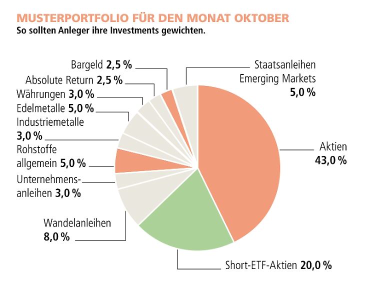 Im monatlichen Musterdepot wird der Aktienanteil auf 43 Prozent reduziert. Darüber hinaus wird die Rohstoffquote von 12,5 Prozent auf 5 Prozent reduziert. Als taktische Maßnahme wird aktuell ein Short-ETF auf den Dax in Höhe von 10 Prozent sowie auf den Eurostoxx50 in Höhe von 10 Prozent temporär in das Portfolio integriert, um das allgemeine Aktienmarktrisiko etwas zu verringern. Diesbezüglich wird ebenfalls die Cash-Quote auf 2,5 Prozent reduziert. Die Quote der Staatsanleihen aus den Emerging Markets in Höhe von 5 Prozent wird beibehalten. Ebenfalls ohne Veränderung bleibt die Quote der Industriemetalle bei 3 Prozent. Darüber hinaus bleiben "Absolute Return"-Strategien, Unternehmensanleihen, Wandelanleihen und Devisengeschäften sowie Edelmetalle gegenüber dem Vormonat unverändert.