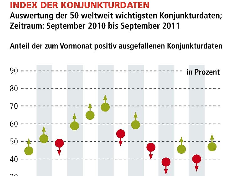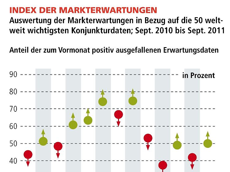 Trotz diverser Unsicherheitsfaktoren in Bezug auf die Lösung der Schuldenkrisen auf beiden Seiten des Atlantiks konstatiert ein Niveau von 47 Prozent noch keine Rezessionssignale für die Weltwirtschaft. Der Index der Markterwartungen stieg ebenfalls leicht auf ein Level von 50 Prozent, was bedeutet, dass eine Hälfte der hier zu Grunde liegenden weltweiten Konjunkturindikatoren besser ausfiel und die andere Hälfte schlechter ausfiel, als es durch die Marktteilnehmer erwartet wurde. Dennoch zeigen die jüngst negativen Preisentwicklungen bei Rohstoffen und Industriemetallen, dass die Anspannungen auf die Realwirtschaft zunehmend stärker werden. Hinzu kommt, dass einige europäische Konjunkturindikatoren bereits das "R-Wort" ("Rezession") zumindest andeuten. Vor allem aus den industriellen Sektoren zeigen die nationalen Konjunkturindikatoren innerhalb Europas, dass die Wirtschaft sich abschwächt.
