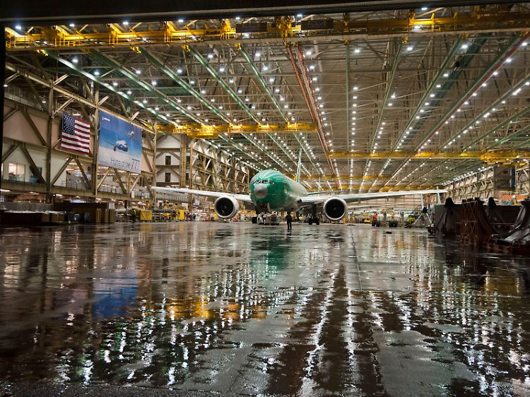 Das größte und schwerste zweistrahlige Passagierflugzeug der Welt: Die 777 im Auslieferungshangar in Everett.